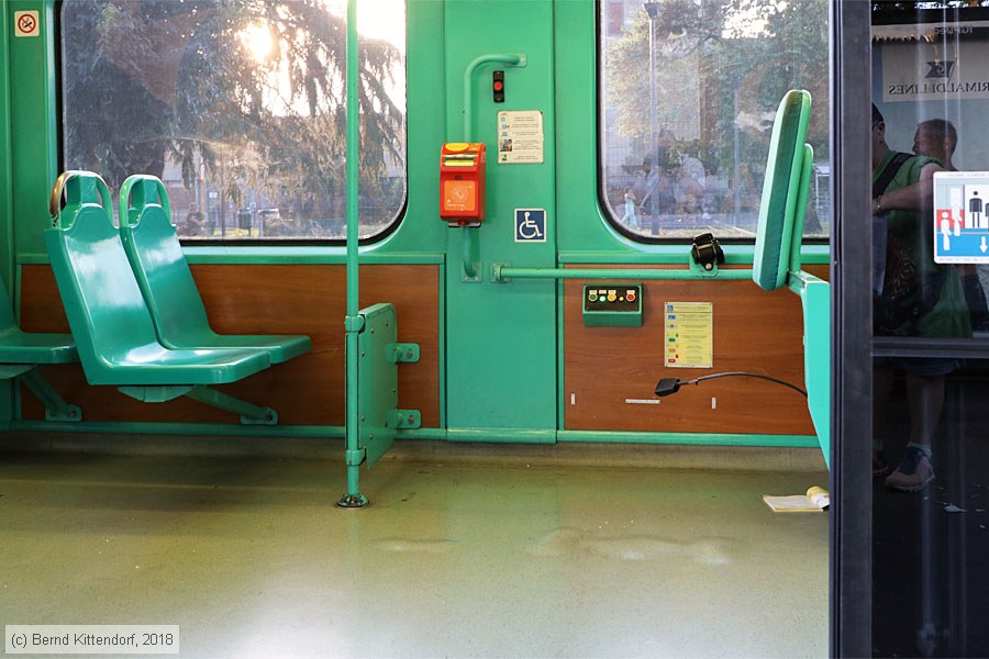 | Tram Milano - 7535 - Innenansicht Rollstuhlplatz im Triebwagen 7535, aufgenommen am 05. August 2018. Die Stellfläche befindet sich gegenüber einer breiten Doppeltür. An diesem Einstieg ist auch eine elektrisch ausfahrbare Rollstuhlrampe vorhanden. Rechts am Bildrand ist die Haltelehne zu sehen. Wenn der Rollstuhl mit seinem Rückenteil dagegen angelehnt steht, wird beim plötzlichen Bremsen des Triebwagens der Rollstuhl weder wegrutschen noch wegrollen können. Der Platz ist für einen kleinen Rollstuhl völlig ausreichend, für normgerechte Rollstühle hingegen knapp. Unpraktisch ist der Fahrkarten-Entwerter angebracht: die anderen Fahrgäste beugen sich zu seiner Benutzung über den Fußbereich des Rollstuhls. Photo: Bernd Kittendorf (info@bernd-kittendorf.de) Homepage: www.bernd-kittendorf.de |