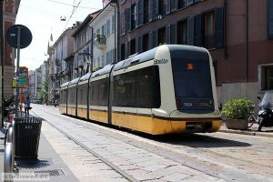 Triebwagen 7604 auf Linie 24 nach Vigentino bei der Ankunft an der Haltestelle Crocetta, aufgenommen am 08. August 2018. Arbeiten an den Haltestellen auch zur Verbesserung der Barrierefreiheit sind an dieser Linie nach Presseberichten ab Ende 2018 vorgesehen.