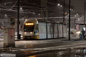 Triebwagen 7607 auf Linie 9 an der Haltestelle Repubblica, aufgenommen abends am 10. Dezember 2017 bei leichtem Schneefall. Von hier führt die Linie 9 zur Stazione Centrale.