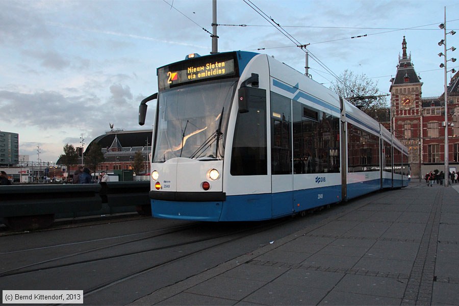 | Straßenbahn Amsterdam - 2049 Triebwagen 2049 auf Linie 2 via omleiding nach Nieuw Sloten bei der Abfahrt von der Haltestelle Centraal Station, aufgenommen am 13. November 2013. Photo: Bernd Kittendorf (info@bernd-kittendorf.de) Homepage: www.bernd-kittendorf.de |
