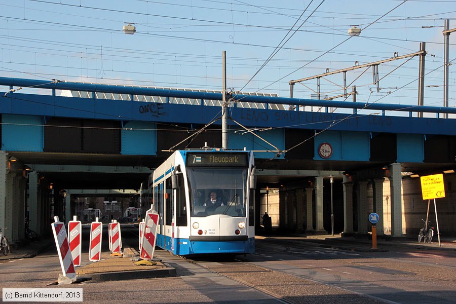 | Straßenbahn Amsterdam - 2094 Triebwagen 2094 auf Linie 7 nach Flevopark bei der Ankunft an der Haltestelle Muiderpoortstation, aufgenommen am 13. November 2013. Photo: Bernd Kittendorf (info@bernd-kittendorf.de) Homepage: www.bernd-kittendorf.de |