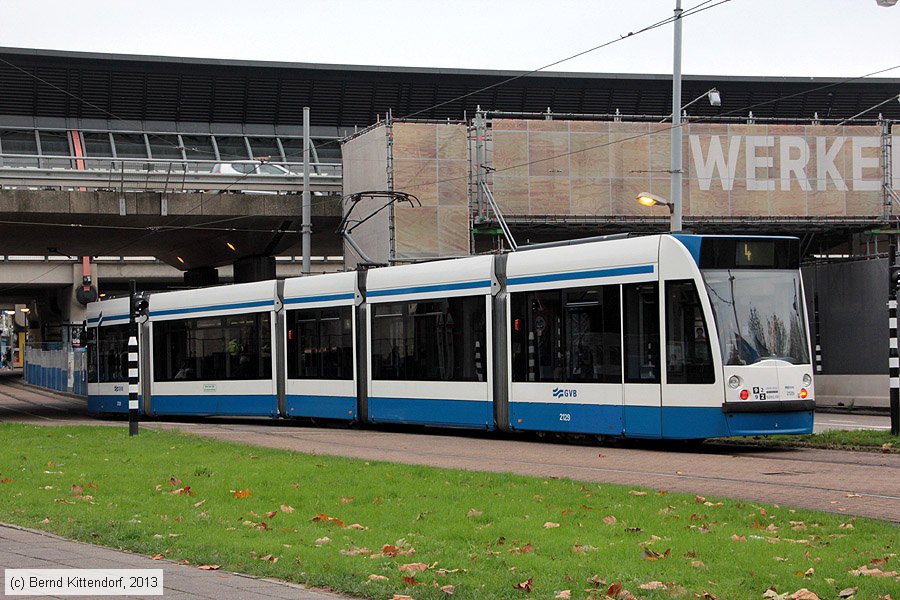 | Straßenbahn Amsterdam - 2129 Triebwagen 2129 auf Linie 4 zur Centraal Station zwischen den Haltestellen Drentepark und Station RAI, aufgenommen am 11. November 2013. Photo: Bernd Kittendorf (info@bernd-kittendorf.de) Homepage: www.bernd-kittendorf.de |