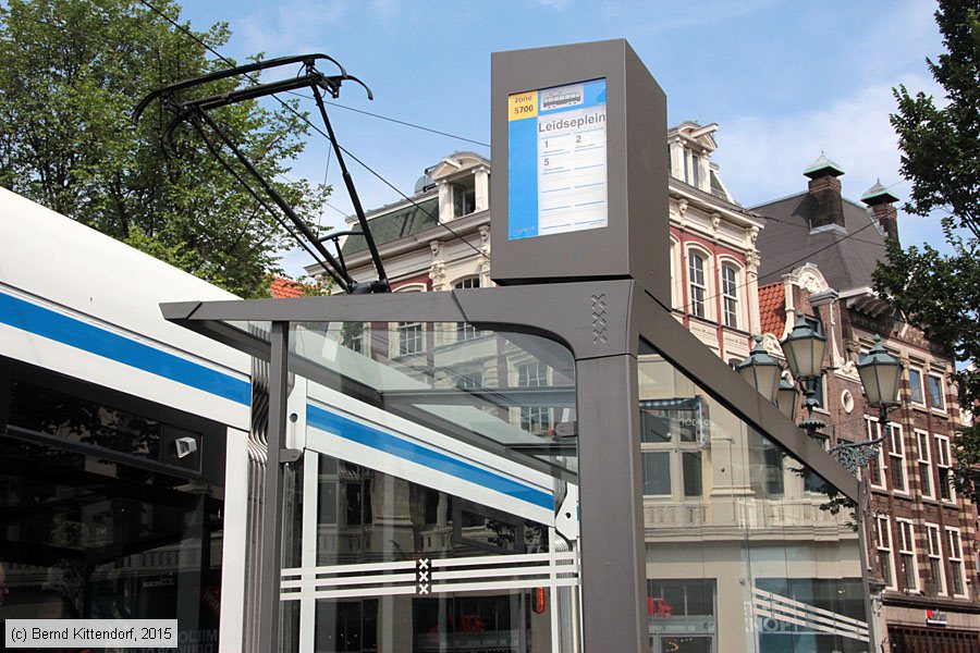 | Straßenbahn Amsterdam - Anlagen Schild der Haltestelle Leidseplein, aufgenommen am 19. August 2015. Hier halten die Linien 1, 2 und 5 zur Centraal Station. Photo: Bernd Kittendorf (info@bernd-kittendorf.de) Homepage: www.bernd-kittendorf.de |