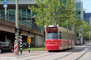Triebwagen 3116 auf Linie 15 zur Centraal Station bei der vorübergehend nicht bedienten Haltestelle Centraal Station - Schedeldoekshaven, aufgenommen am 20. Mai 2014.