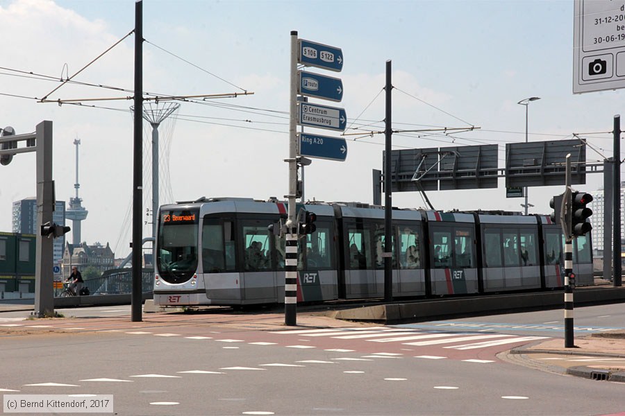 | Straßenbahn Rotterdam - 2002 Triebwagen 2002 auf Linie 23 nach Beverwaard bei der Ankunft an der Haltestelle Wilhelminaplein, aufgenommen am 19. Juni 2017. Photo: Bernd Kittendorf (info@bernd-kittendorf.de) Homepage: www.bernd-kittendorf.de |