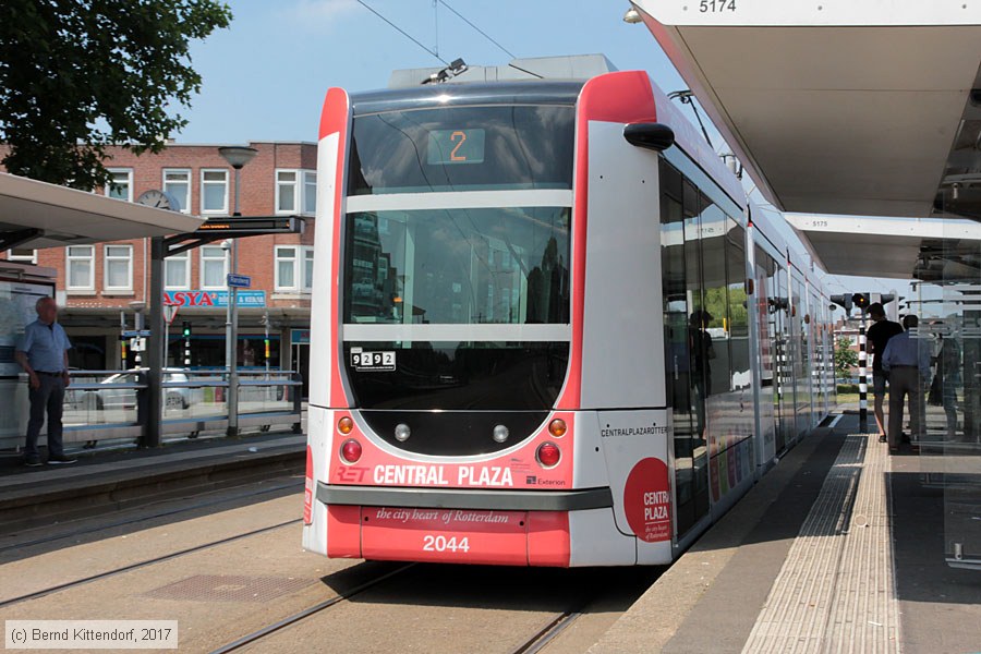 | Straßenbahn Rotterdam - 2044 Triebwagen 2044 auf Linie 2 nach Charlois an der Haltestelle Randweg, aufgenommen am 19. Juni 2017. Photo: Bernd Kittendorf (info@bernd-kittendorf.de) Homepage: www.bernd-kittendorf.de |