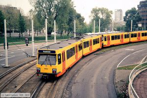 Triebwagen 5001, aufgenommen am 04. August 1984. Diese sechsachsigen Zweirichtungswagen wurden in der Schweiz hergestellt, sind 29,8 m lang, 2,65 m breit und bieten 80 Sitzplätze (dazu acht Klappsitze im Eingangsbereich) und 124 Stehplätze.