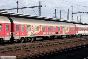 Wagen 61 56 19 70043-3 (Typ Aeer) im Bahnhof Bratislava Hlavná Stanica, aufgenommen am 25. Februar 2010. Schade, daß die Fensterfläche für Werbung teilweise zugeklebt wurde - und das bei einem Wagen für Fahrgäste mit Fahrkarten für die 1. Klasse.