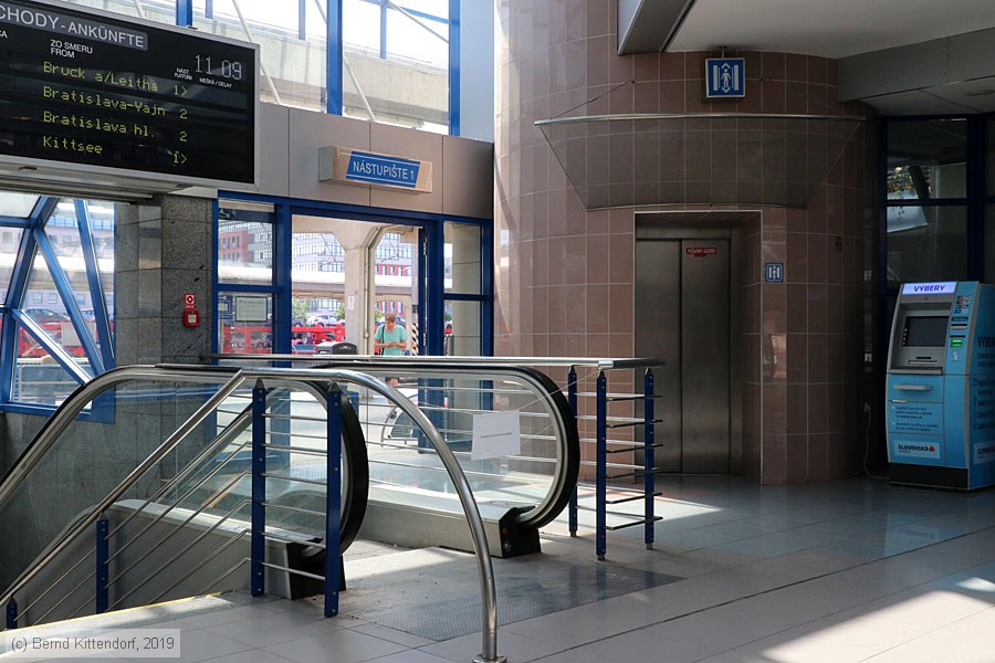 | Bahnhof Bratislava-Petržalka Ausgang auf dem Empfangsgebäude des Bahnhofs Bratislava-Petržalka zum Bahnsteig (Nástupište) 1, aufgenommen am 26. Juli 2019. Zur Personenunterführung zum Inselbahnsteig 2 gibt es die Treppe, die Rolltreppe und einen Aufzug. Photo: Bernd Kittendorf (info@bernd-kittendorf.de) Homepage: www.bernd-kittendorf.de |