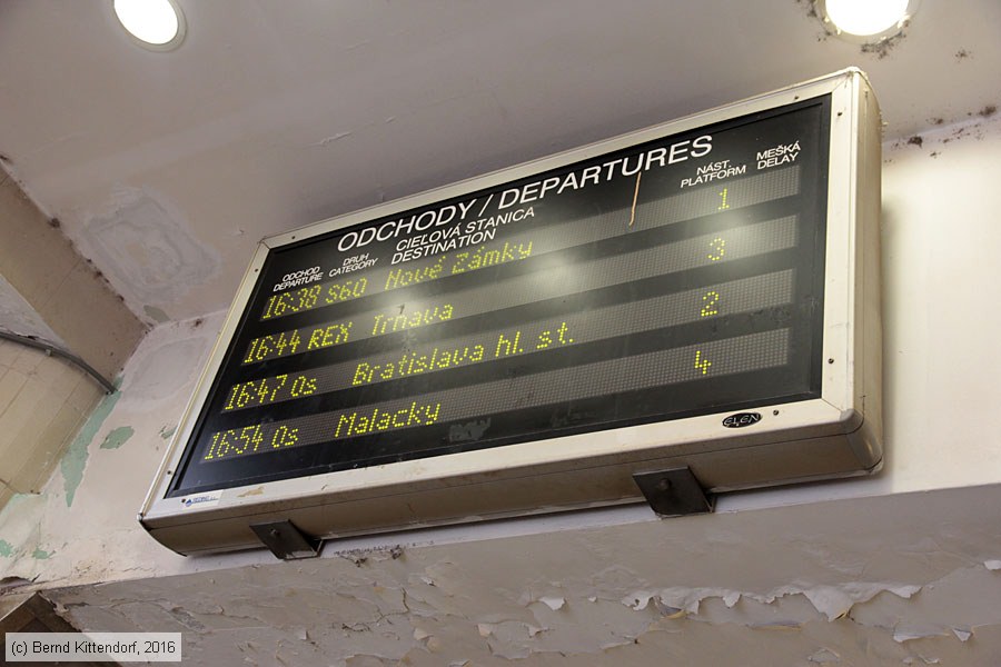 | Bahnhof Bratislava Vinohrady Anzeige der nächsten Abfahrten am Haltepunkt Bratislava Vinohrady, aufgenommen am 02. September 2016. Das Gerät befindet sich in der Bahnsteigunterführung beim Zugang aus Richtung der Straßenbahnhaltestelle. Photo: Bernd Kittendorf (info@bernd-kittendorf.de) Homepage: www.bernd-kittendorf.de |