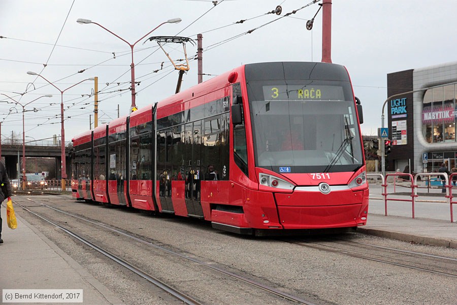 | Straßenbahn Bratislava - 7511 Triebwagen 7511 auf Linie 3 nach Rača an der Haltestelle ŽST Vinohrady, aufgenommen am 24. Februar 2017. Photo: Bernd Kittendorf (info@bernd-kittendorf.de) Homepage: www.bernd-kittendorf.de |