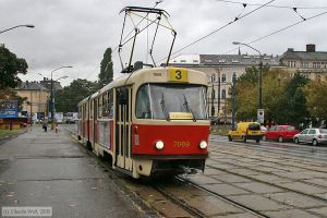 Triebwagen 7084 auf Linie 14 nach Ružinov nahe der Haltestelle Kamenné Námestie, aufgenommen am 16. September 2008. Der 1977 gebaute Triebwagen war von Dezember 1977 bis Februar 2010 im Bestand und wurde im Laufe des Sommers verschrottet.