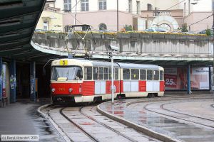 Triebwagen 7064 (Hersteller ČKD, Typ K2) auf Linie 14 nahe der Haltestelle Jesenského, aufgenommen am 16. September 2008. Das Fahrzeug gehört zur Serie 355 - 374 (20 Stück) aus dem Jahr 1975. Bis 1983 lautete die Wagennummer 373, dann erhielt der Wagen die jetzige Betriebsnummer.