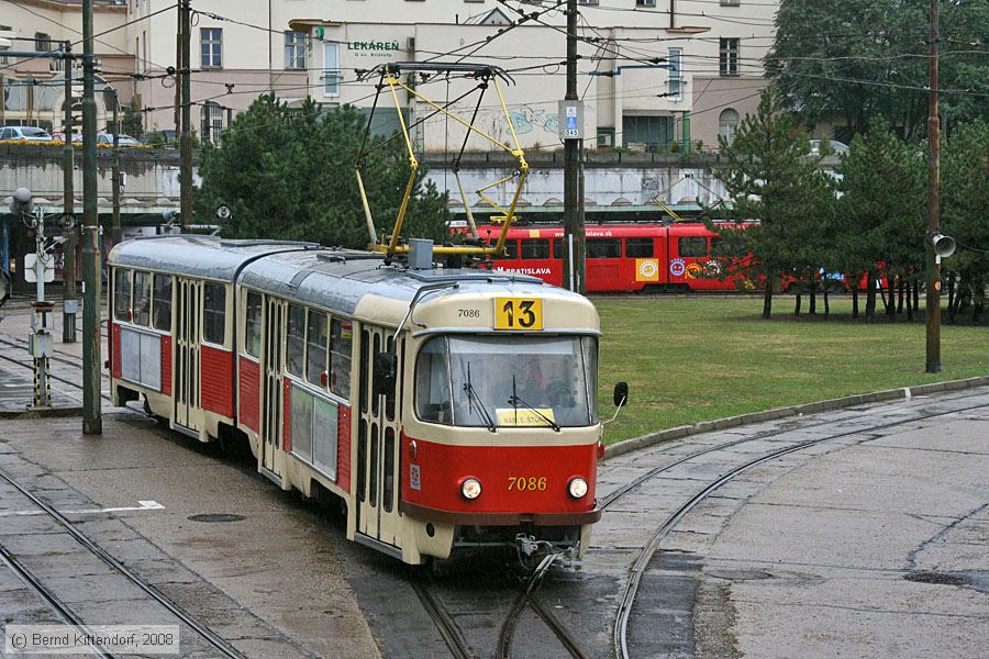 | Straßenbahn Bratislava - 7086 Triebwagen 7086 (Typ K2YU) auf Linie 13 nach Nám. Ľ. Štúra bei der Abfahrt von der Haltestelle Hlavná Stanica, aufgenommen am kalten und regnerischen 16. September 2008. Das Fahrzeug gehört zur Serie 7085 - 7087 (drei Stück) aus dem Jahr 1983. Der Typ K2YU hat eine Länge von 20,40 m (über Kupplung 21,50 m), eine Breite von 2,50 m und die Fußbodenhöhe beträgt 90 cm. Die Fahrzeuge verfügen über vier Türen, haben ein Leergewicht von 21.800 kg, vier Motoren zu 40 kW (je zwei im vorderen und hinteren Drehgestell) und erreichen eine Höchstgeschwindigkeit von 65 km/h. Photo: Bernd Kittendorf (info@bernd-kittendorf.de) Homepage: www.bernd-kittendorf.de |