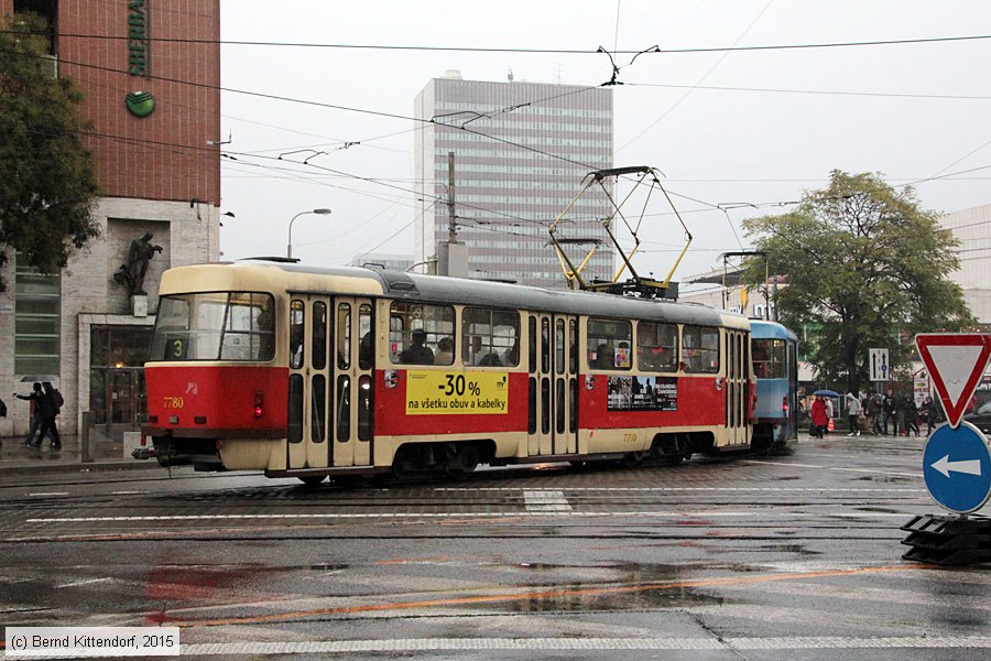 | Straßenbahn Bratislava - 7780 Triebwagen 7780 auf Linie 3 nach Rača am Námestie SNP bei der Fahrt in die Špitálska, aufgenommen am 16. Oktober 2015. Vorn am Zug befindet sich Triebwagen 7779. Photo: Bernd Kittendorf (info@bernd-kittendorf.de) Homepage: www.bernd-kittendorf.de |