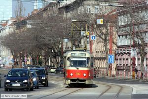 Triebwagen 7829 auf Linie 4 nach Karlova Ves bei der Ankunft an der Haltestelle Trnavské Mýto, aufgenommen am 15. März 2011. Triebwagen 7829 wurde 1987 von ČKD als Typ T3 SUCS gebaut.