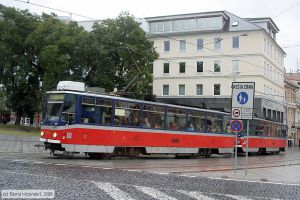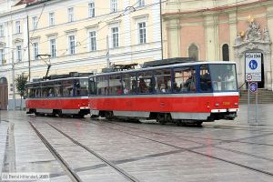 Triebwagen 7957 auf Linie 5 bei der Haltestelle Poštová am 16. September 2008.