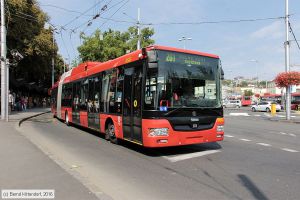 Gelenk-Trolleybus 6815 auf Linie 201 nach Dolné hony - Čiližská bei der Abfahrt von der Haltestelle Hlavná Stanica, aufgenommen am 02. September 2016.