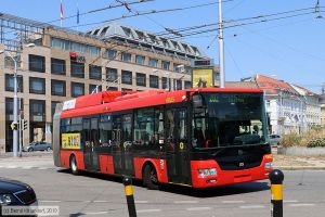 Das dreiachsige Fahrzeug hat fünf Doppeltüren für den Fahrgastwechsel. An dieser Stelle kreuzen sich die Fahrleitungen von Trolleybus und Straßenbahn (links oben am Bildrand).